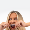 - Peel off the longer strip and press onto upper teeth, folding over the back to secure.